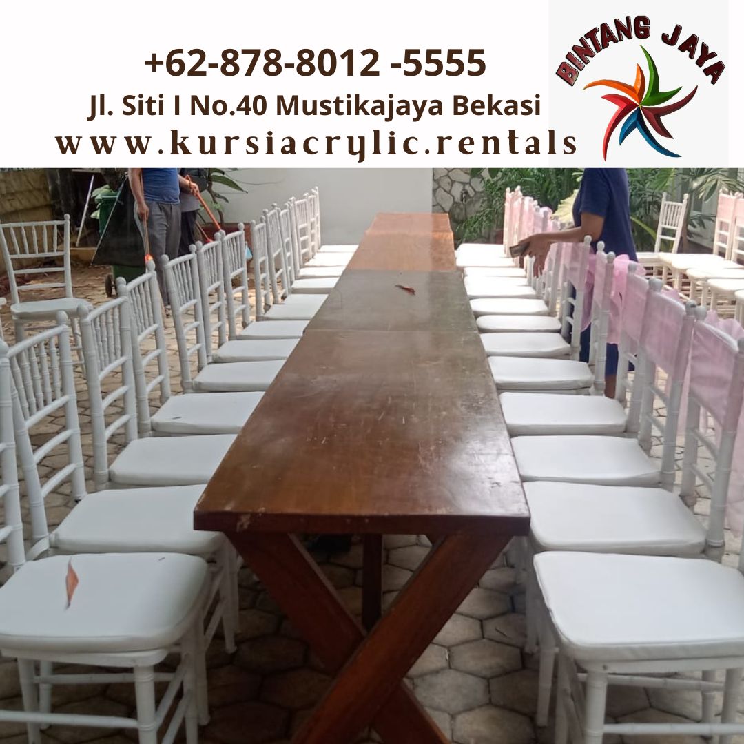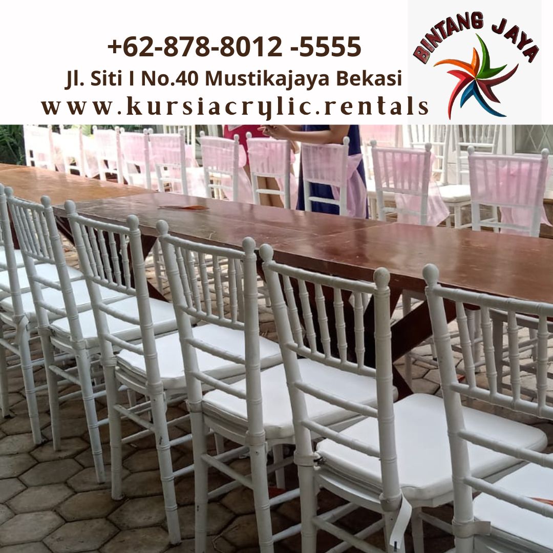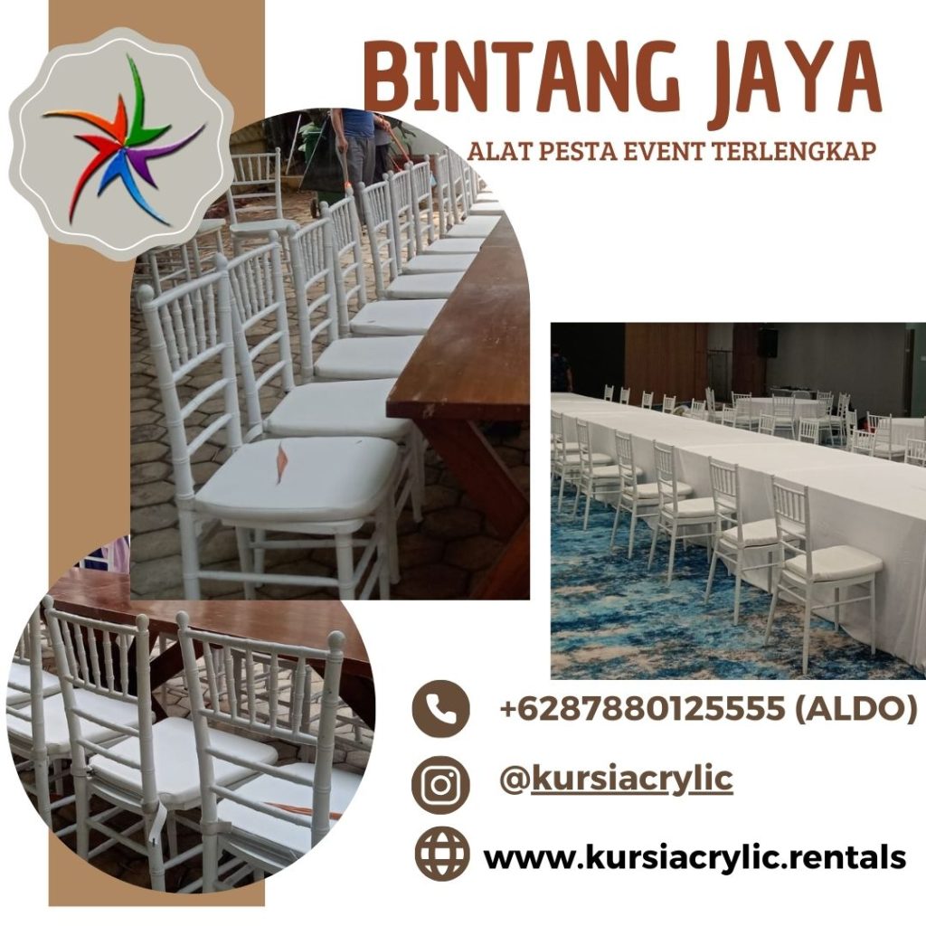Rental kursi Tiffany kayu warna putih di area Jaksel menawarkan sejumlah keuntungan. Pertama, warnanya yang putih memberikan nuansa elegan yang dapat disesuaikan dengan berbagai tema dekorasi. Selain itu, material kayunya menambah kesan semula jadi dan tahan lama, memastikan kenyamanan dan daya tahan sepanjang acara.