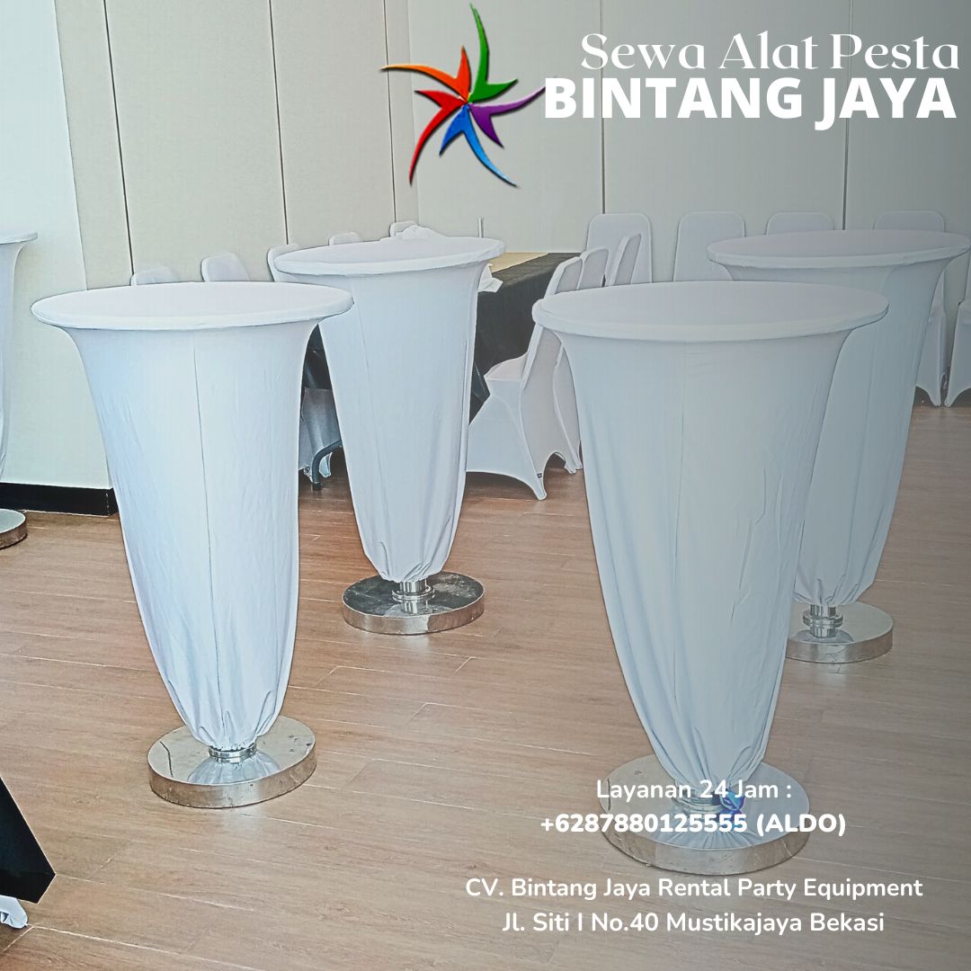 Sewa Meja Bar Kaki Stainless Cover Putih Area Terdekat Jakarta