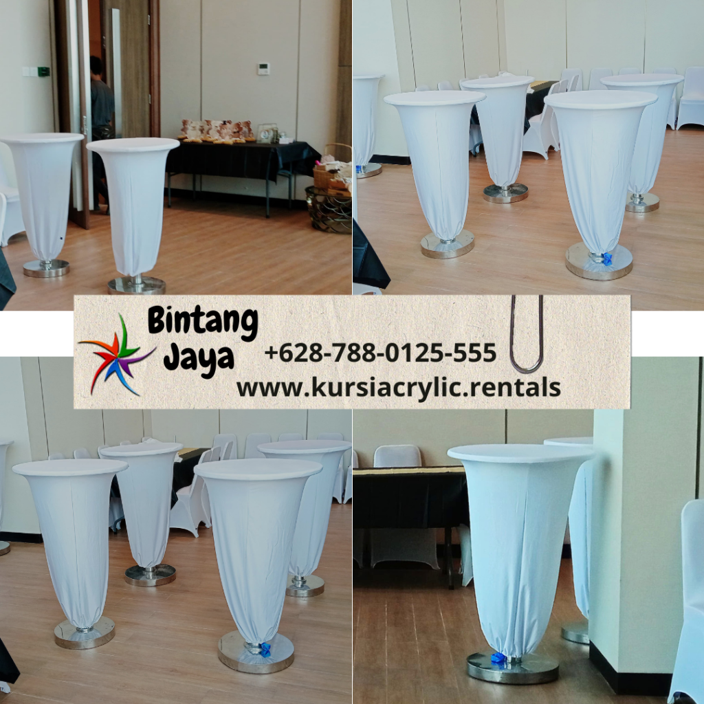 Meja bar kaki stainless memiliki daya tahan yang luar biasa serta estetika yang menarik. Selain itu, cover putih memberikan kesan bersih dan rapi, cocok untuk berbagai jenis acara. Dari pesta ulang tahun hingga pernikahan, meja ini dapat disesuaikan dengan tema Anda. Pastikan untuk bertanya tentang kebijakan perawatan dan kebersihan dari penyedia ketika Anda menyewa meja bar.